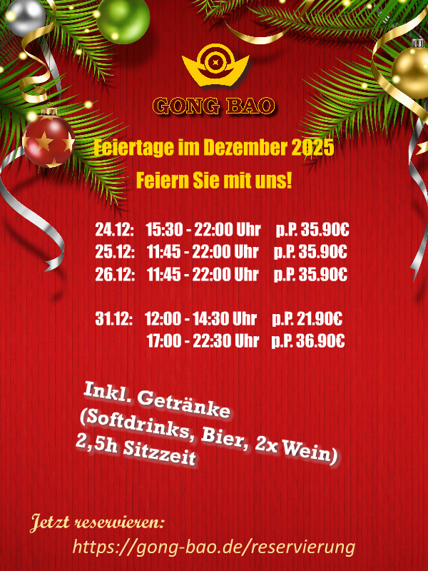 Herzlich Willkommen in Ihrem Gong Bao Chinarestaurant! Wir freuen uns, Sie auf unserer Internetseite begrüßen zu dürfen. Hier finden Sie Informationen zu unseren Speisen und Angeboten, alles Wissenswerte über unser Restaurant und nicht zuletzt regelmäßige Hinweise auf Specials und Aktionsangebote. Bitte sehen Sie sich in Ruhe um, informieren Sie sich - und träumen Sie in Gedanken vielleicht schon vom nächsten Besuch in unserem Restaurant. Wir freuen uns bereits auf Sie! Ihr Gong Bao Team
